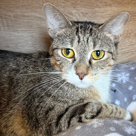 Hi, I'm Flannel! I am as comfy and cozy as your favorite flannel. And look at my coat - it looks like I'm wearing a flannel jacket! I'm very sweet and like being picked up and held. I'm a big fan of getting brushed and getting nose bops. Churu treats are a great way to get to know me (if you're asking.) I like to play but might not show it until you initiate some games - then watch out! I like almost all toys, including Cat Dancer, laser light and string. I like catnip, and then hanging by the window on my cat tower. If you're looking for a warm, furry, friend, please come and bring me home!